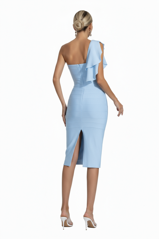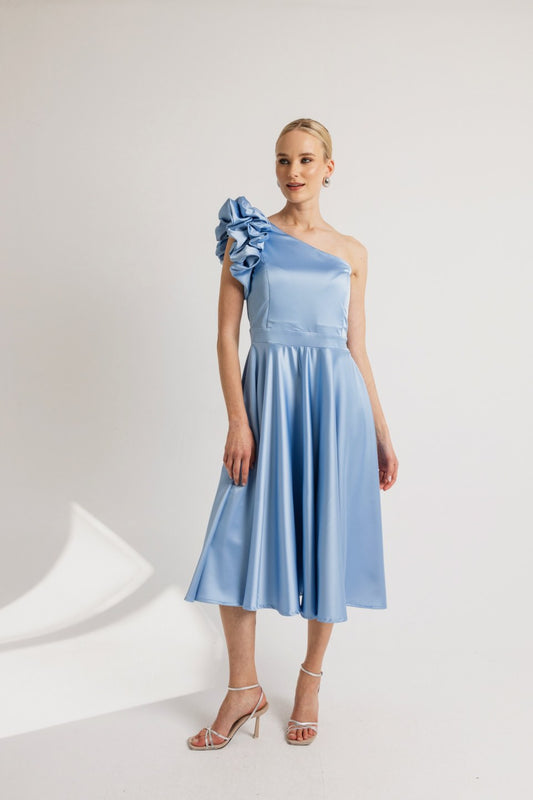 Midi σατέν φόρεμα με βολαν στον ώμο baby blue