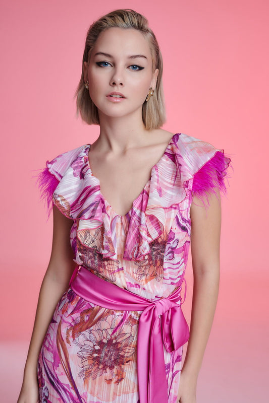 Μπλε φλοραλ φόρεμα με βολάν και ντραπε ντεκολτέ
