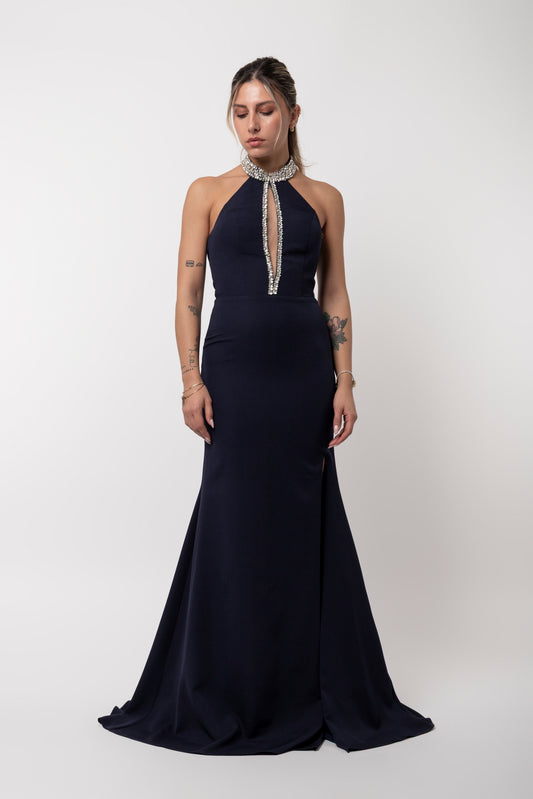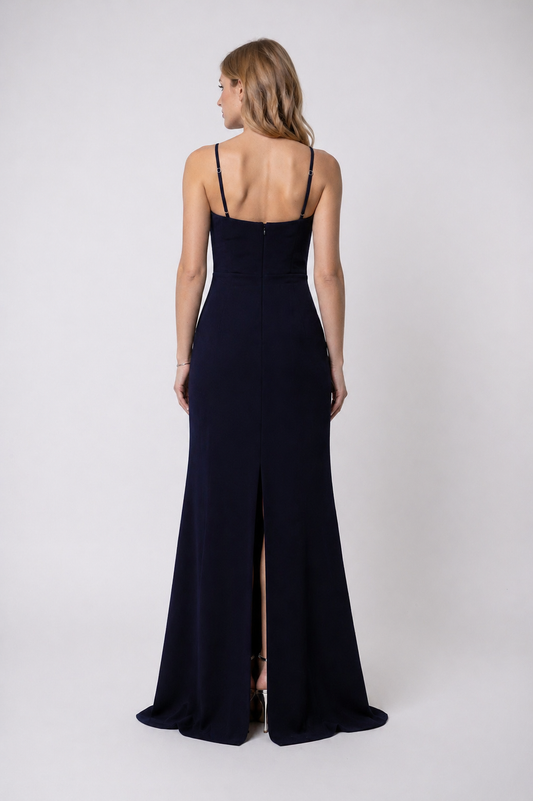 Maxi Βραδινό Φόρεμα Σκούρο Μπλε & Φόυξια για Γάμο DR-1002-46