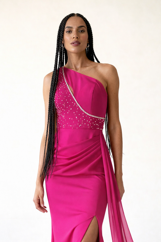 Maxi Βραδινό Φόρεμα Φούξια με ένα ώμο για Γάμο DR-1001-48