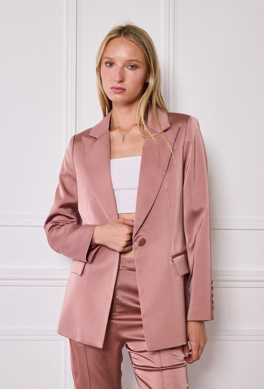 Σατέν Κοστούμι Ροζ Nude με Καμπάνα Παντελόνι και Μεσάτο Σακάκι
