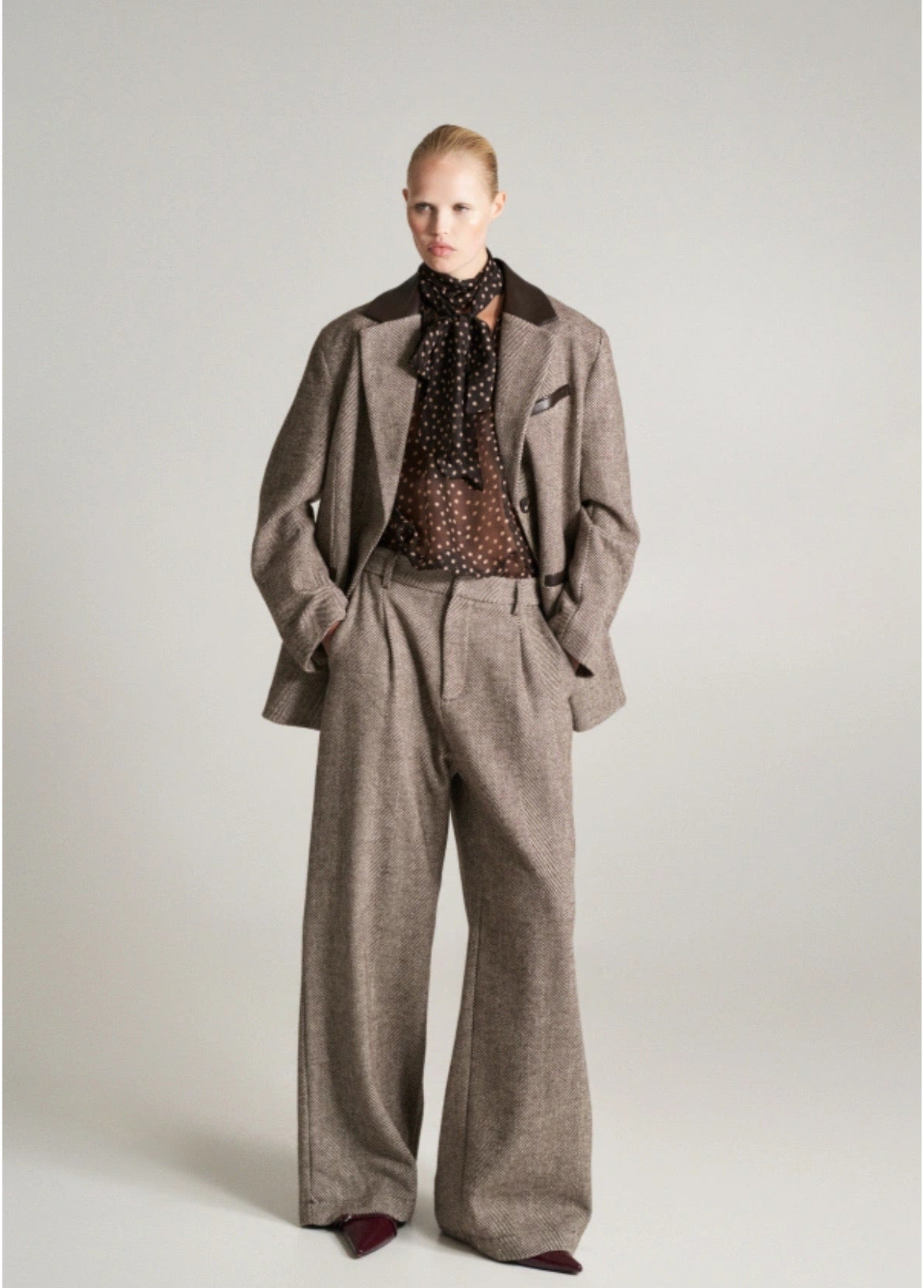 Κομψό και διαχρονικό, αυτό το μάλλινο παντελόνι σε ύφανση ψαροκόκαλο χαρίζει ζεστασιά και refined αισθητική στις καθημερινές και πιο formal εμφανίσεις σας. Η wide leg γραμμή προσφέρει άνεση και άψογη εφαρμογή, ενώ οι πιέτες μπροστά προσθέτουν μια elegant δομή στο ντύσιμο. Συνδυάζεται ιδανικά με το αντίστοιχο blazer “blazer με δερμάτινες λεπτομέρειες» πουλόβερ, πουκάμισα ή το αντίστοιχο blazer για ένα ολοκληρωμένο, sophisticated σύνολο.