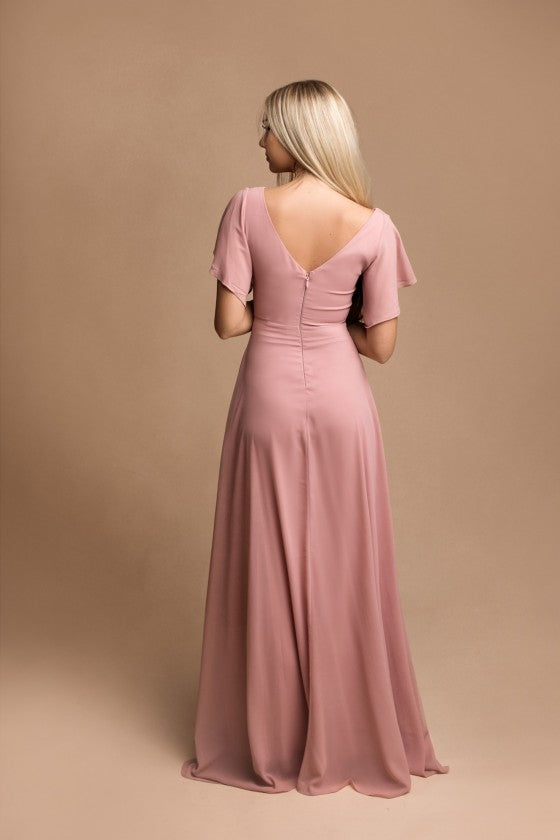 Maxi romantic formal v neck dress with short sleeve in dusty pink with strass belt details.