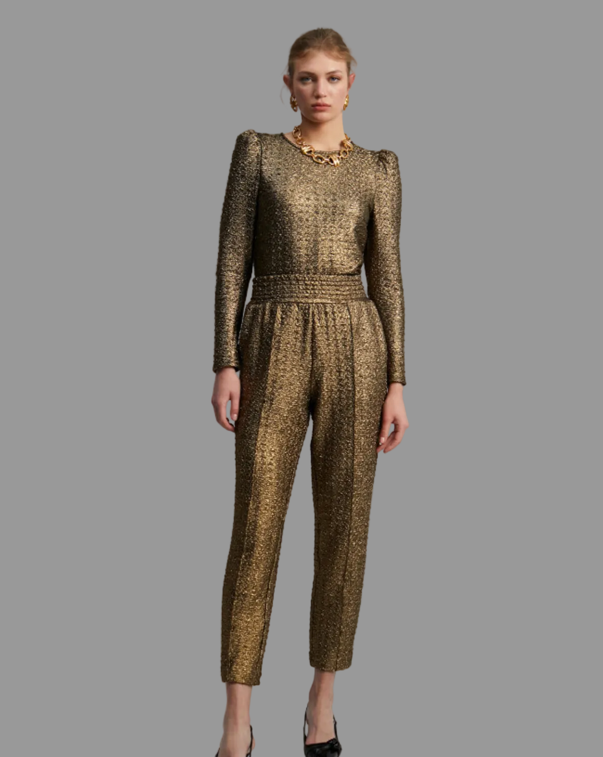 Αυτή η designer μπλούζα είναι η τέλεια επιλογή για να δημιουργήσετε elegant γυναικεία outfits που μεταβαίνουν εύκολα από την ημέρα στη βραδινή έξοδο. Συνδυάστε την με παντελόνια για ένα sophisticated καθημερινό look ή με μια φούστα για πιο επίσημες εμφανίσεις. Το μεταλλικό χρυσό χρώμα προσθέτει μια statement λεπτομέρεια που θα κλέψει τις εντυπώσεις.