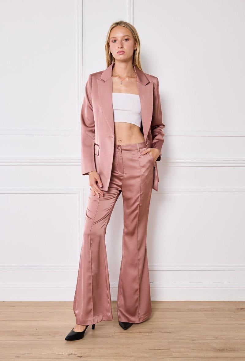 Σατέν κοστούμι ροζ nude με καμπάνα παντελόνι και μεσάτο σακάκι